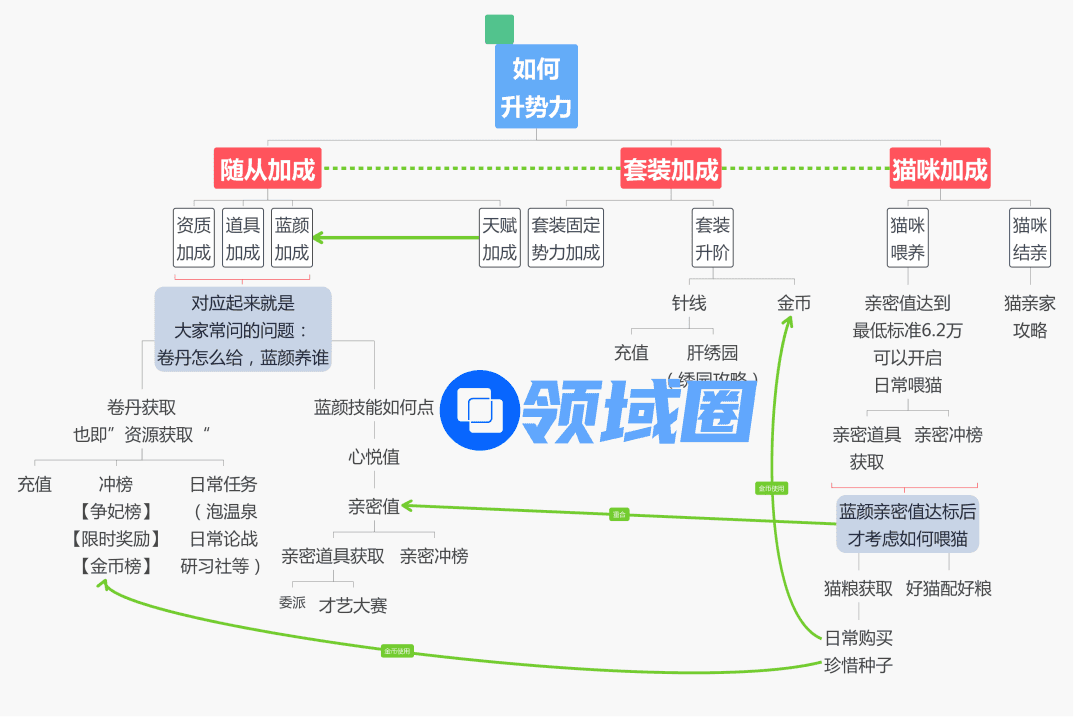 在势力组成的各个部分,占比最重要的3个部分就是【随从加成】 ,【套装加成】和【猫咪加成】。因此想要升势力,就要着重从这3方面提升。