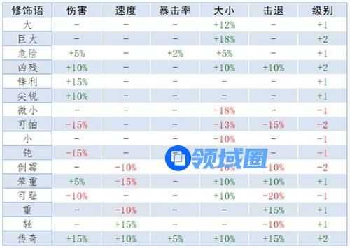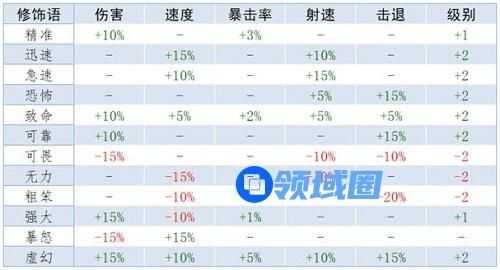 2.相较于饰品词条,武器的词条要复杂的多,一个词条往往涉及多个属性的变化。第一类武器词条称为通用词条,连枷、矛、悠悠球、回旋镖、链锯、钻头(包括斧钻)和叶绿手提钻只能拥有通用词条,因为它们的速度无法改变。以下列出通用词条表。