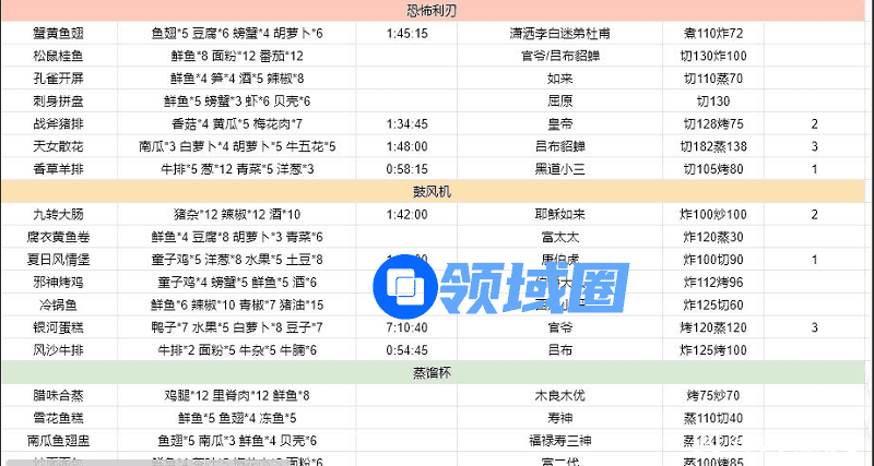 2、有需要的玩家,按照上图的配方和材料就可以制作出金符文的菜系了,这也是目前最全的菜谱了。
