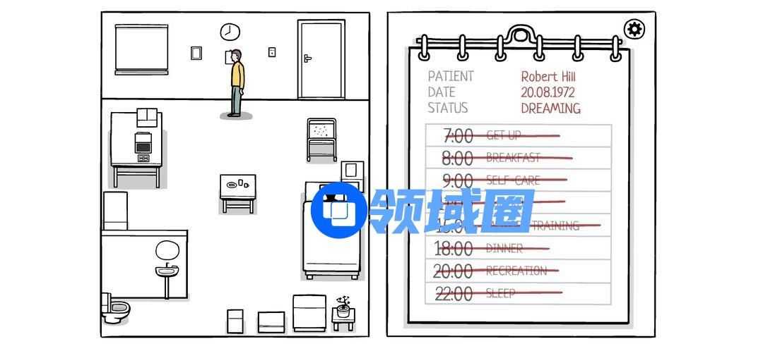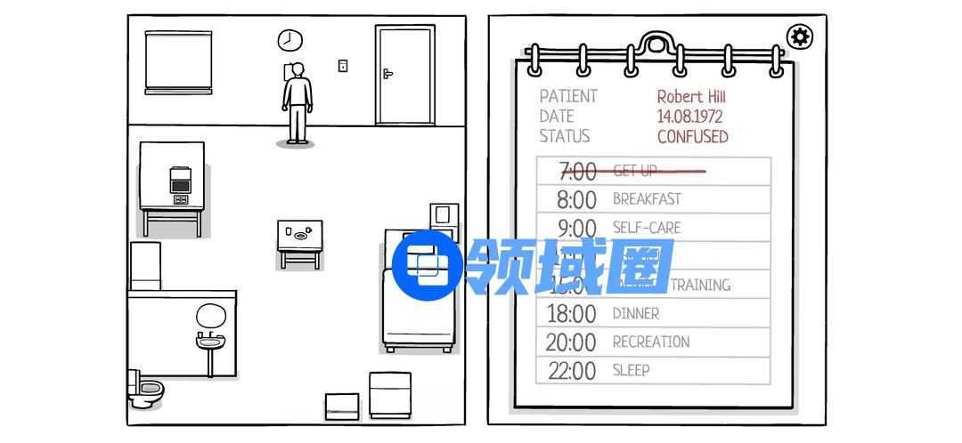 起来观察房子一圈,发现作息表,根据作息表安排:起床,吃早饭,洗漱,查房,记忆训练,晚餐,娱乐活动,睡觉(以后作息表省略,毕竟没有变化)