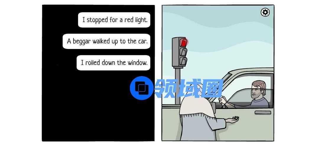 然后开车路上遇到乞讨者拉下车窗(按住窗子下拉),给予硬币(按住手臂下拉),等绿灯(点击红绿灯)