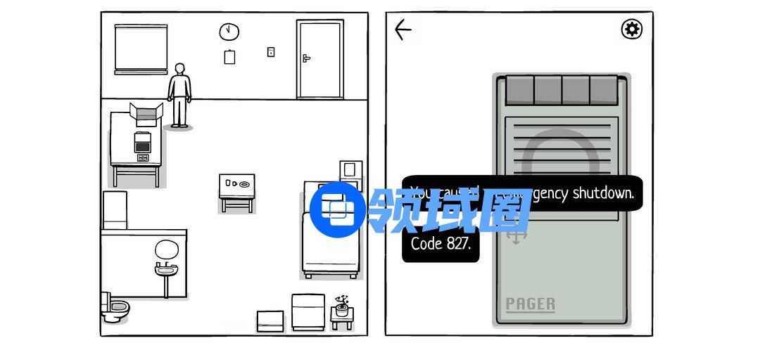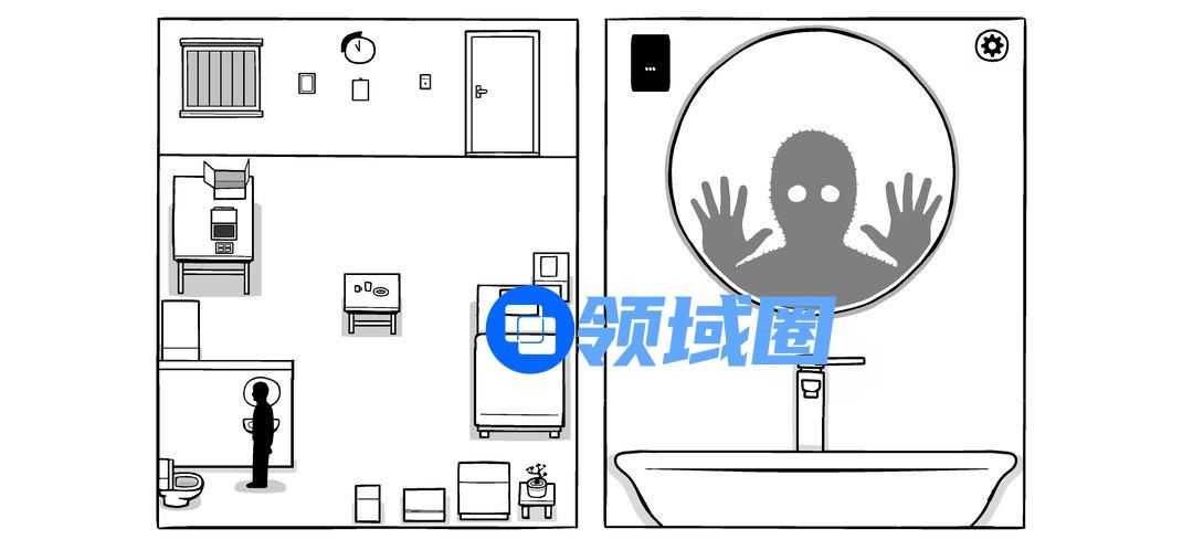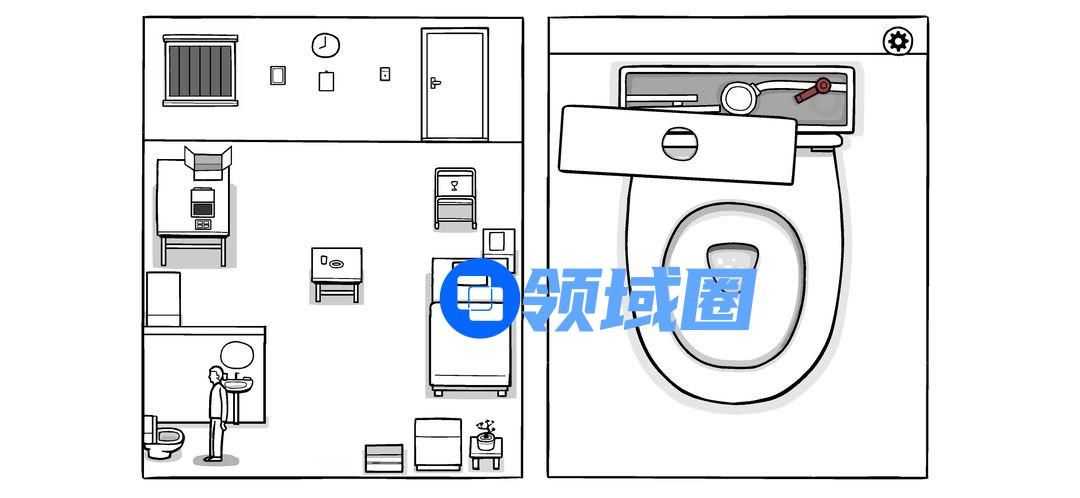 开始捣蛋第一步。点击冲水马桶按钮四下,盖子松落,移开盖子,按一下红色小把手,再按冲水按钮,让马桶坏掉,警报响起。
