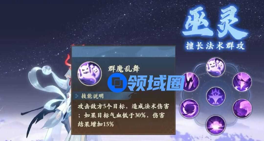 巫灵,法术群攻,攻击敌方5个目标,血量越低伤害越高,被动是增加自身法术伤害结果,特点增伤法连