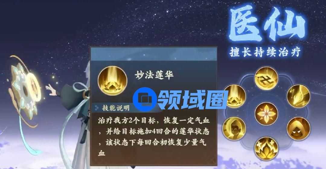 医仙,持续治疗,每回合给两个目标加上持续回血的状态,被动是提高回血状态的治疗效果,特点隐身提速