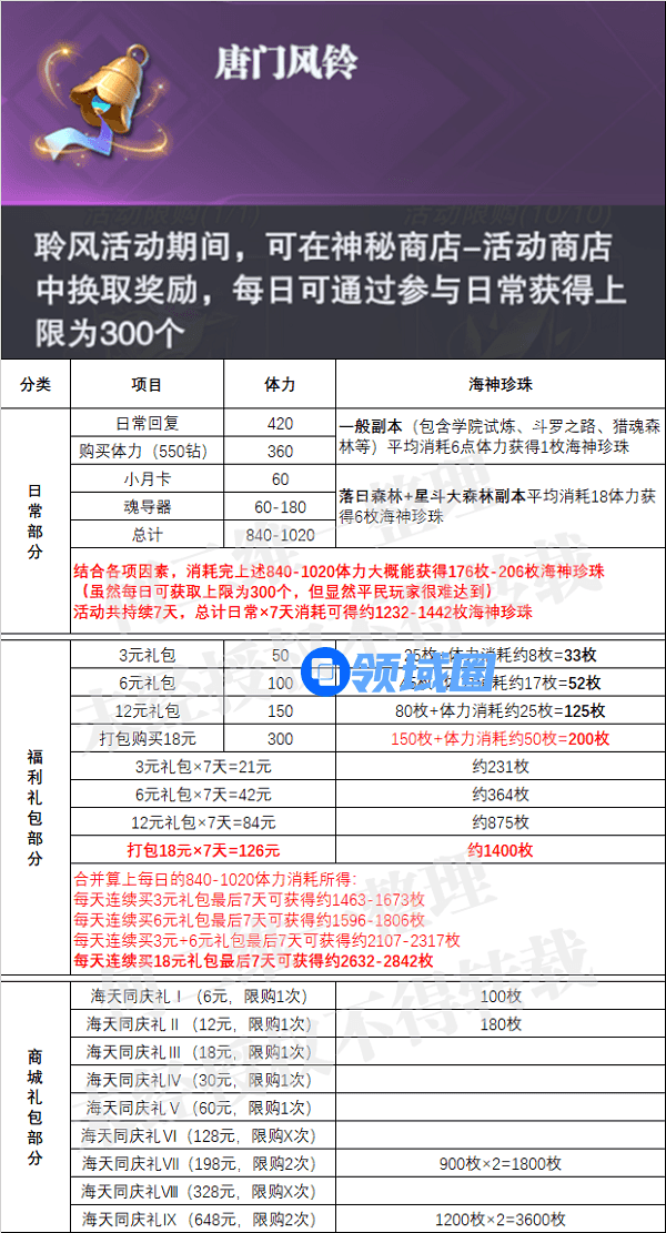 1.此次活动大致保留了和上次的海神珍珠活动类似的体力消耗比例,不过此次活动中因为有不少朋友已经拥有了魂导器,所以体力上也会出现一定的变化,这里也给大家简单计算了一下,每天都买完6次体力可以获得840体力-1020体力,其中的变化便是由魂导器的60-180体力而得的,而每日消耗完这些体力我们大概可以获得176-206个唐门风铃,活动持续7天便可以获得1232枚-1442枚唐门风铃,这个数据大家可以简单参考一下