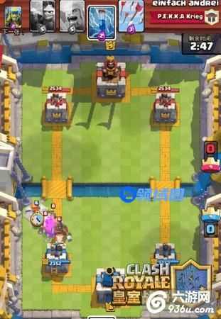 可以看到,对面扔了野猪加哥布林,为什么要扔女武呢?主要是为了把哥布林解决,哥布林伤害比野猪高多了,其次可以反场一波,给对面巨大的压力。
