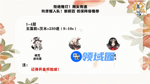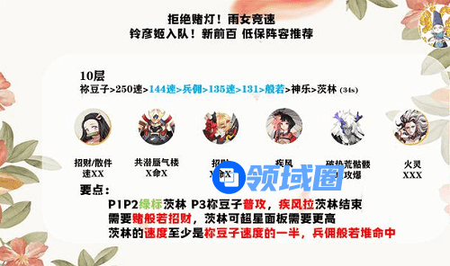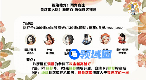 1、称豆子>260速>修>铃彦姬>130速>晴明>樱花>食灵(7层47s,9层30s)