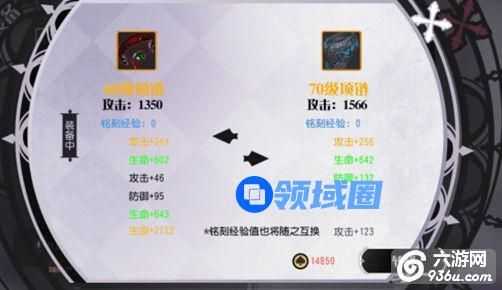 装备铭刻是后期开放的培养系统,属于装备吃装备升级从而提升基础属性的玩法。铭刻需要消耗同等级同品质的装备,每件装备提供一定的铭刻经验值,当铭刻等级提升后,玩家相应的装备基础属性也会随之提升。