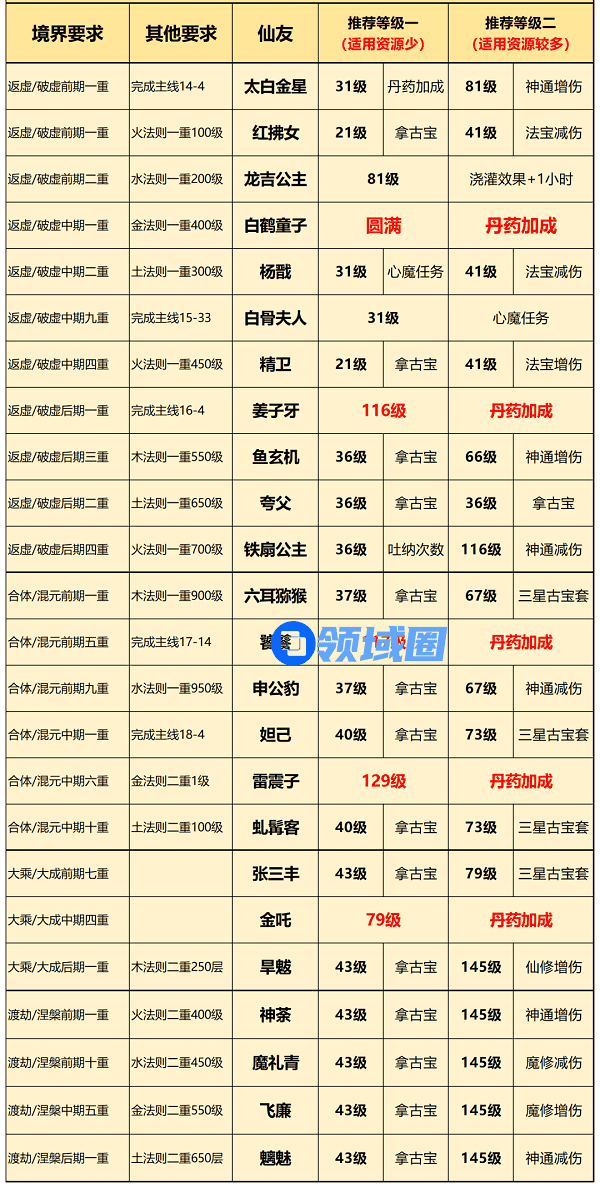 1、上图中红色字体等级的仙友激活后直接培养到指定等级,最好能提前囤积好一定资源等激活后直接培养!