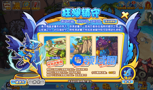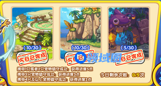 4、一共有三处海岸需要镇守,每天有5次机会,携带宠物越少,镇守成功所得的进度越多: