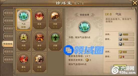 在修炼室可升级帮派技能来提升战力,帮派技能可升级等级由帮派修炼室等级来决定,升级帮派技能消耗帮贡和银元