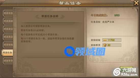 每天可以领取20个帮派任务,做任务可获得帮贡和经验。