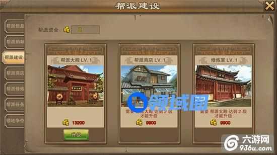 帮派建设分为帮派大殿、帮派商店、帮派修炼室,帮派大殿等级决定帮派商店和修炼室的可升级等级