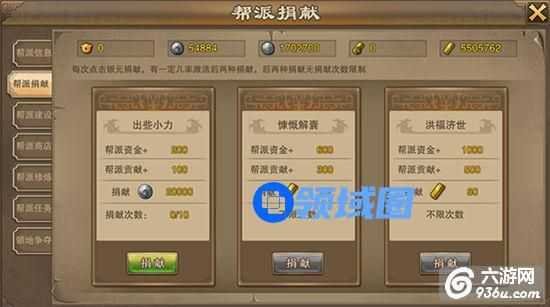 帮派捐献有银元和金条捐献两种,银元捐献是默认开启的捐献方法,金条捐献是银元捐献之后随机触发开启的。如果触发了30金条捐献,使用30金条捐献则有几率触发50金条捐献或者只剩银元捐献;如果触发了50金条捐献,使用50金条捐献则有可能触发30金条捐献或者只剩银元捐献