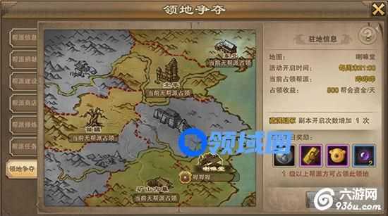 领地争夺是帮派之间的PVP玩法,开启时间是周六21:00开启。帮战无等级限制,只要在帮派中就可以参加战斗。帮派可以占领的地图和帮派等级有关,帮派达不到该地图所需帮派等级则不能占领。领地争夺中占领该地图的帮派每天会根据地图获得不同的帮会资金。帮派成员也可以获得相应的奖励。