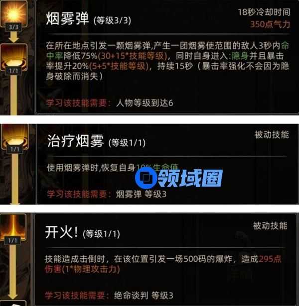 3.这个技能是主要保命技能,在当前区域内释放烟雾弹,在区域内的敌人三秒内的命中率降低75%,并且自身进入隐身并且暴击率提升20% 持续十五秒,不会因为隐身的结束而结束,如果人物技能点了[无情]和[开火!]时会有奇效。