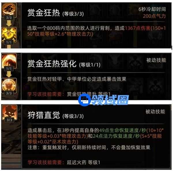 1.[赏金狂热]在升级至[赏金狂热强化]后会对轻甲、中甲敌人造成暴击伤害,再搭配上[无情]这个被动技能增加40%的暴击伤害,并且这个[赏金狂热]在暴击的情况下可以刷新技能冷却,非常的微妙,这就容易出现这个人物技能耗蓝严重的情况,不过没有问题,在人物等级提升后可以学习[狩猎直觉]这个技能,这个技能能够在三秒内提升生命回复和发力回复的速度。
