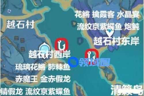 8、越石村东:花鳉、擒霞客、水晶宴、流纹京紫蝶鱼、炮鲀。