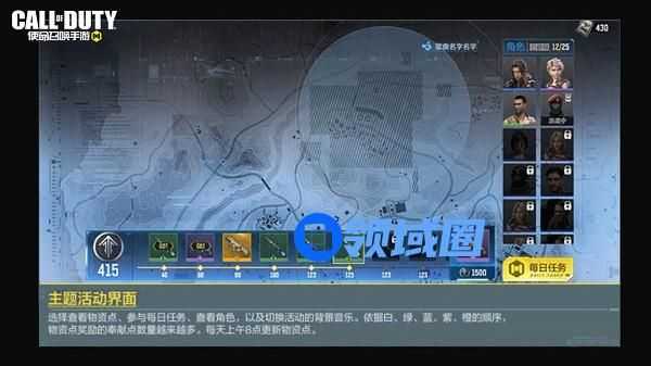 2.在主题活动界面,战士们可以参与每日活动、查看角色,以及切换活动的背景音乐。依据白、绿、蓝、紫、橙的顺序,物资点奖励的奉献点数量越来越多。每天上午8点更新物资点。