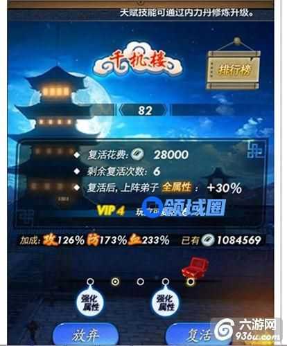 大家应该都知道前面挑困难的打吧,三星通关的话第二天可以直接跳过此楼,每五层楼奖励一些银币材料箱子钥匙之类的,失败了可以花银币元宝复活会加30%的攻血防BUFF,前两次复活只需要银币,后面就需要元宝了,VIP等级越高可以复活的次数越多。