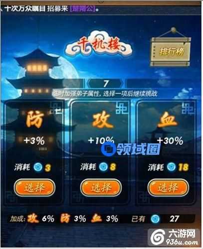 每通关三层可以加一次,尽量选18点能量的加,优先选暴击和速度,然后是攻击,其次是血量,防御不要加,实在想加的可以加些,不要超过200%,闪避和招架对技能伤害无效,所以不推荐加,如果你觉得自己实在有点脆皮就加一些吧。本人玩的区 有四五个V13,我一个V12经常霸占千机楼三四名左右压力山大啊。