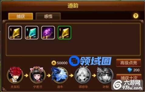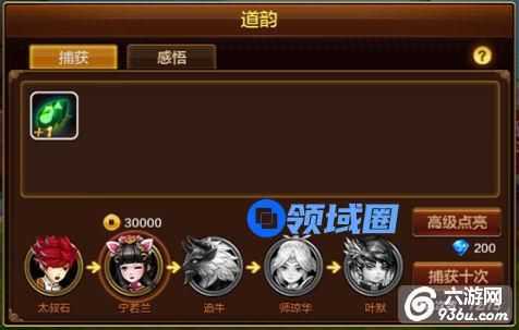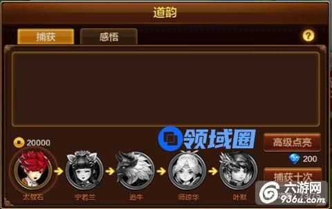 每次捕获道韵时有几率点亮下一个英雄头像,也有概率回到原点重新开始,越往后越有几率获得更好的道韵,高级点亮就是消耗元宝直接点亮后面的英雄头像进行捕获。