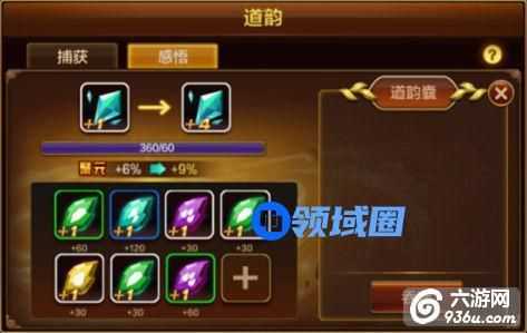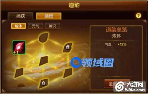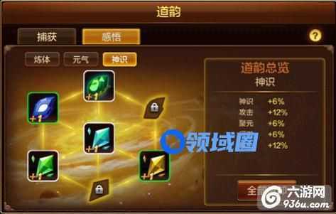 获得了道韵怎么用呢?且听本道君继续说明。道韵界面上分别有捕获和感悟两个功能,切换到感悟界面,是这样子的效果: