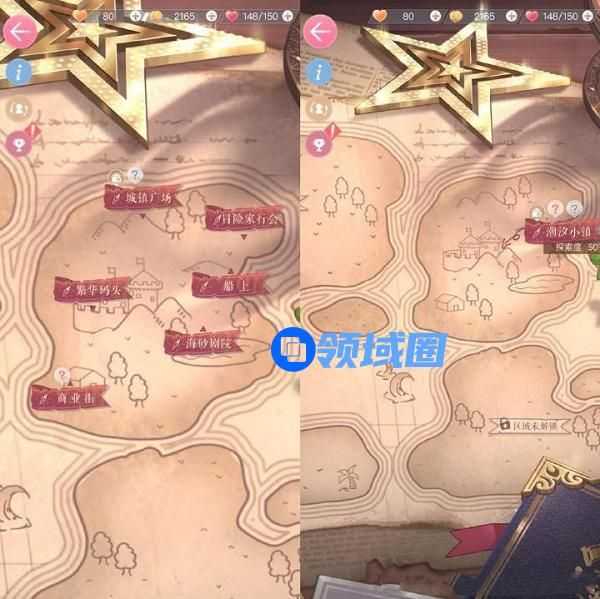 ③航海图:点击后可看到本次活动的地图范围,一共有5个大区域,每个区域里都含有若干个小地点,地点上标有粉色问号的是主要任务的地点,蓝色问号是奇遇任务的地点,小船标志为当前所在地,完成任务可增加当前大区域的探索度,随着剧情开展,区域逐步开放