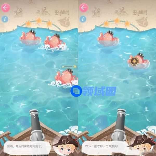 当怪物在炮台攻击范围内会出现瞄准点(如下方右图所示)点击瞄准点开炮,每次开炮后CD为2秒,在怪物行进到固定位置,攻击船之前还会有6秒倒计时,在倒计时结束前攻击怪物即可(见下方左图)