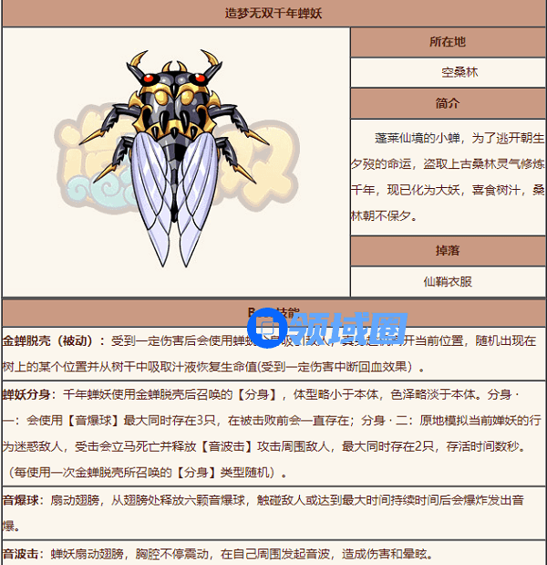 千年蝉妖是造梦无双近期上线的新boss,很多玩家都想要知道造梦无双千年蝉妖技能是什么,游戏宝小编为大家带来造梦无双千年蝉妖技能表。