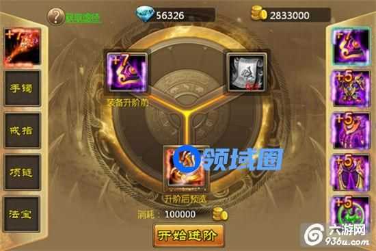 装备到达紫色+7或橙色+9可以进行装备进阶升级,进阶后颜色外貌发生变化,并且增加装备属性。