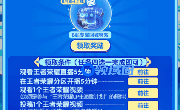 2、需要从观看王者荣耀直播5分钟,在王者荣耀分区开播5分钟,观看1个王者荣耀视频(必须是参与“王者荣耀UP主激励计划”的稿件),投稿1个王者荣耀视频(投稿视频必须带tag#王者荣耀#)中选择一个完成即可。