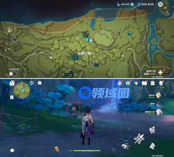 1.首先来到恒那兰那如图位置,装备森林书任务赠送的“老旧的诗琴”,将恒那兰那改为梦境状态,即天空为紫色状态。
