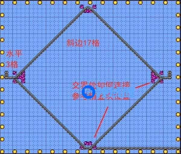 3.菱形矿道的四个边需要17格轨道,左右两端需要搭建水平三格的矿道。搭建要点在于要讲两端的尽头用锤子敲成一个会将矿车回弹的弹簧型桩子,以及铁轨的连接处也用锤子敲好。保证矿车能在菱形矿道上朝一个方向转圈圈。 在菱形矿道搭好以后,就可以尝试无伤遛猪鲨了。