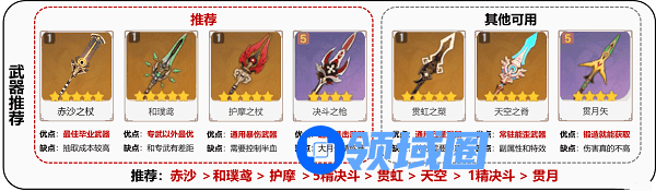 一、武器推荐:赤沙 >和璞鸢 > 护摩 >5精决斗 > 贯虹 > 天空 > 1精决斗 > 贯月
