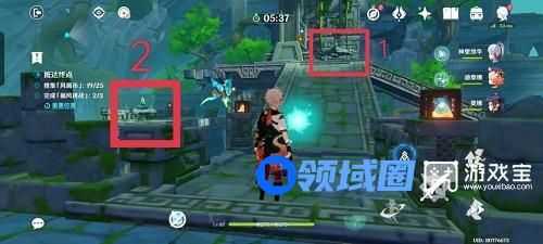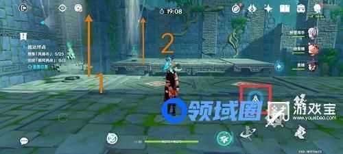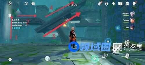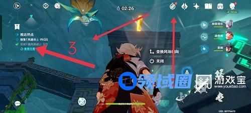 2、来到第二个房间,仍然首先点击控风按钮,关闭所有风场。依次将图中将1处风向向左、将2处风向向上并开启、乘坐2处风场来到3处将风向向左、回头将2处风向向左。原路返回,点击控风按钮,开启所有风场,按照如图箭头顺序,收集并完成挑战。