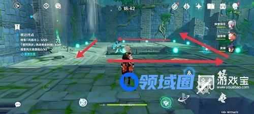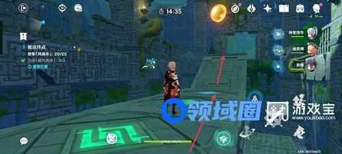 6、首先点击控风按钮,关闭所有风场。向前行走,来到此处并下落到前方平台。到达平台后,点击控风按钮,开启风场,平台上升。如图箭头所示所示回头拿风循币。继续向任务点前进。