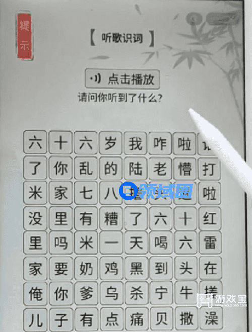 2、不知道歌词的可以按照上面的顺序结合你听到的音乐来消除字。