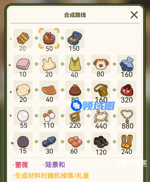 3、其中,蔷薇可生成价值10基础材料和44基础材料的物品,而夏彦可以生成价值15基础材料和20基础材料。