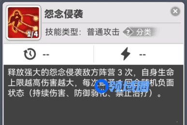 1、普攻-怨念侵袭:攻击敌方全体3次,生命上限越高伤害越高,每次挂1回合随机负面。