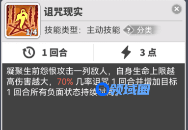 2、主动-诅咒现实:攻击一列敌人,生命上限越高伤害越高,70%诅咒1回合并增加目标1回合所有负面持续时间。