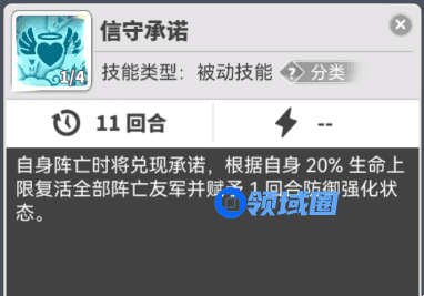 3、被动-信守承诺:阵亡时兑现承诺,根据自身20%生命上限复活去哪不阵亡友军并赋予1回合防御强化。