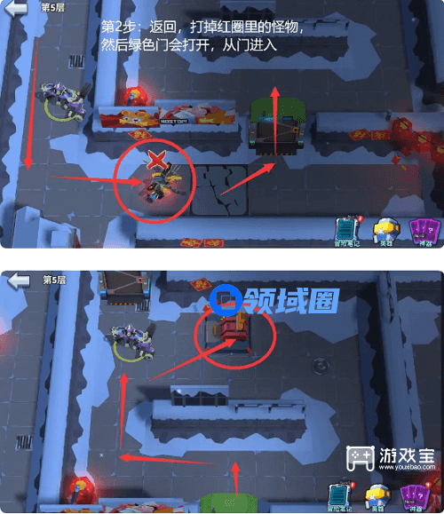 8、第9步:按照箭头指示方向,依次踩机关,打掉2个怪物。(如上图所示)