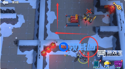 5、第6步:按照红色箭头方向前进,先不开门,不要捡宝箱。(如上图所示)