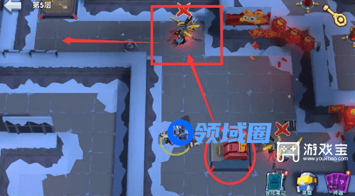 7、第8步:红圈机关打1下,然后打掉红框里的怪,然后向箭头指示方向出去。(如上图所示)