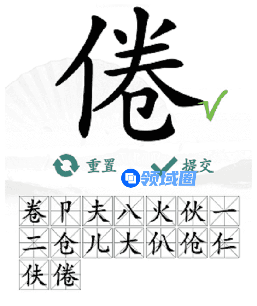 1、卷、卩、夫、八、火、伙、一、二、仓、儿、大、仈、伧、仁、伕、倦。