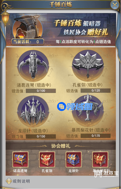 活动期间累积活跃值转化为锻造值,消耗锻造值锻造暗器,锻造成功后领取协会赠礼
