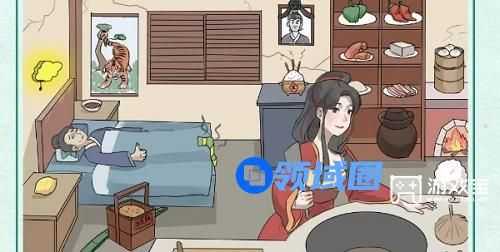 5、拇指煎包:将床上人的拇指、与橱柜后面的包子放到一起。
