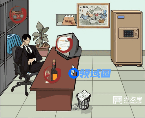 从左到右找,收音机;点击男子屁股下面的简历(优先触发);点电脑屏幕,英文网页和红酒;垃圾桶里的病历;画向右划动,露出里面绝密文件;拖动花盆里的钥匙打开保险柜,里面遗嘱;拖动上方奖杯到柜子印迹处,打开地下室入口,点击进入。