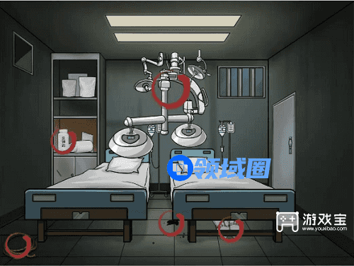 从左到右找,地上绳子;柜子里安眠药;中间特殊仪器;中间地上黑色,不明痕迹;向上划动床单,床底脚。